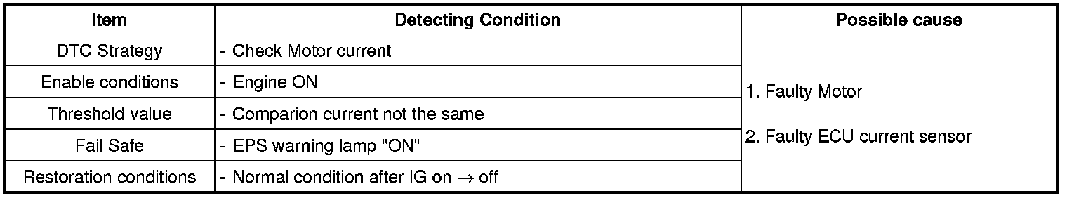 EPS (MDPS=Motor Driving Power Steering) Control Module sets this code and inhibits EPS function if a gap between two values is out of specified range.
