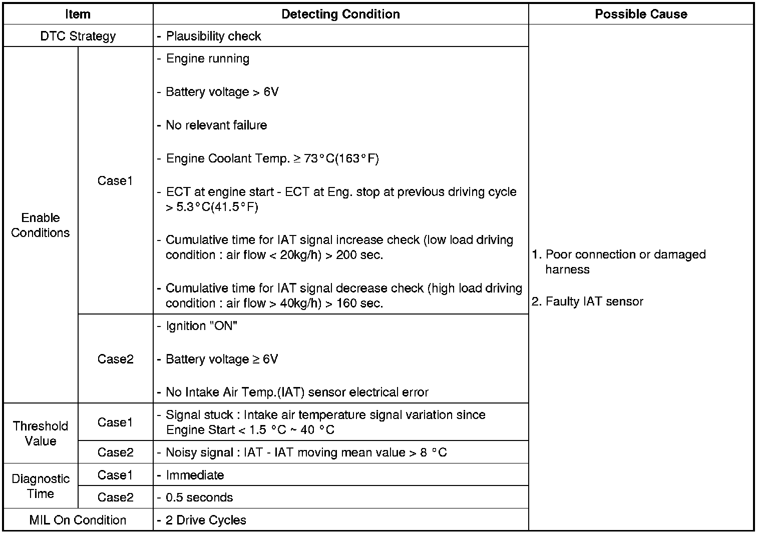 The purpose of this diagnosis is to detect a stuck intake air temperature signal. The diagnostic function checks whether after a variation of the calculated intake air temperature also a variation of the measured intake air temperature is detected. PCM sets DTC P0111 when the variation of measured intake air temperature from engine start is smaller than threshold while variation of calculated intake air temperature by PCM is greater than threshold.