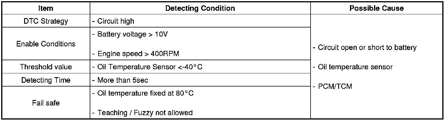 This code is set when oil temperature sensor value is input higher specification to PCM/TCM.
