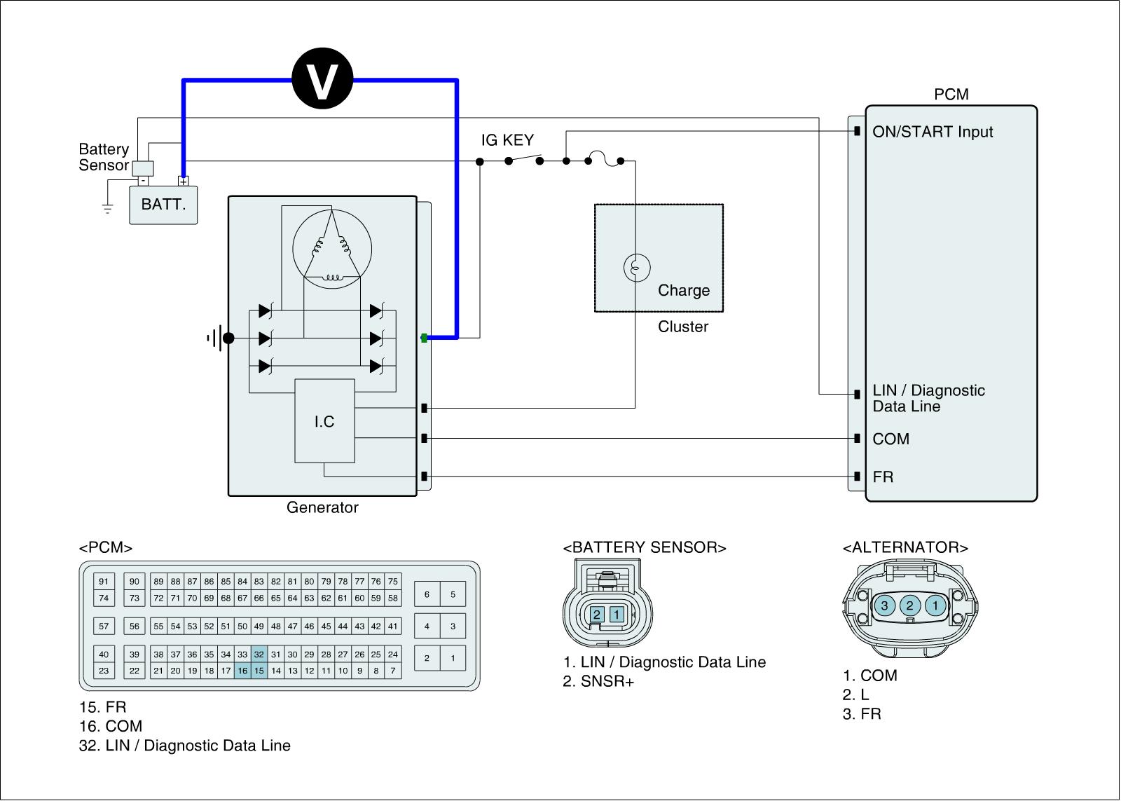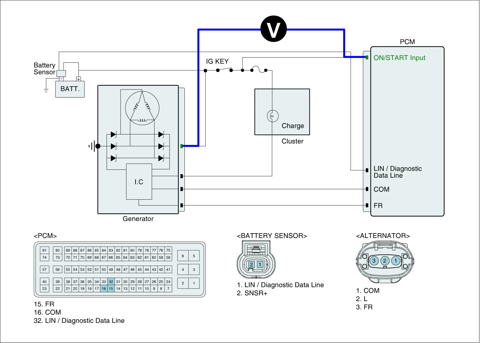 2. Measure the voltage between on/start input terminal of PCM and B terminal of alternator.