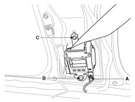 2. To remove the seat belt anchor pretensioner (C), keep on pushing the lock pin (A) as arrow direction. And then remove the seat belt after pushing the lock pin (B).