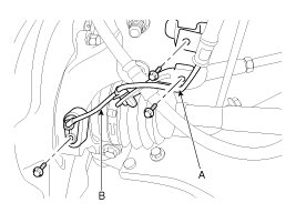 2. Remove the wheel speed sensor (B) from the front strut assembly by loosening mounting bolts (A).