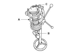 5. Remove the front strut assembly and then loosen the strut mounting nuts (A).