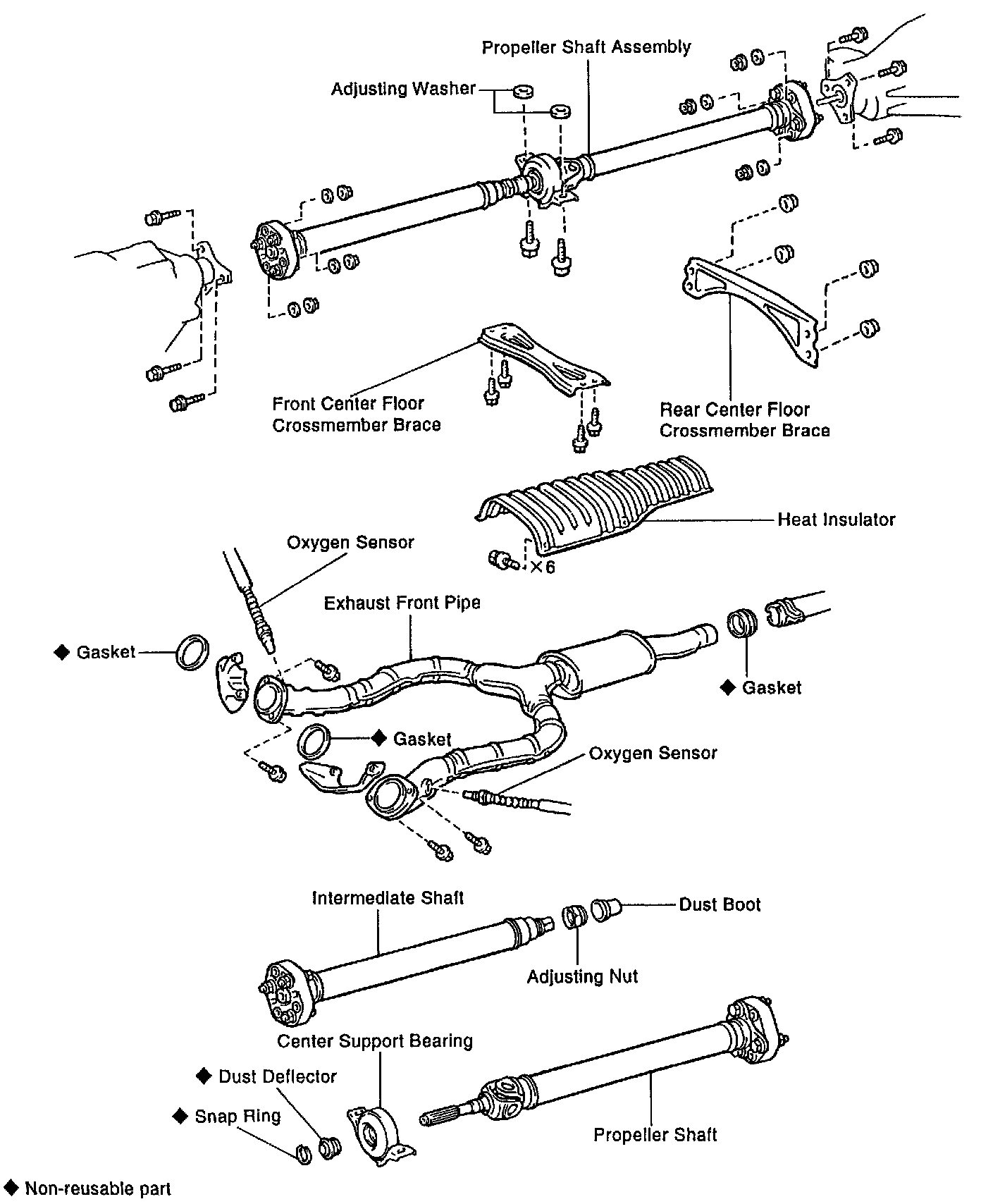 NOTICE: When removing the set bolts, support the center support bearing by hand so that the transmission and intermediate shaft, and propeller shaft and differential, remain in a straight line.