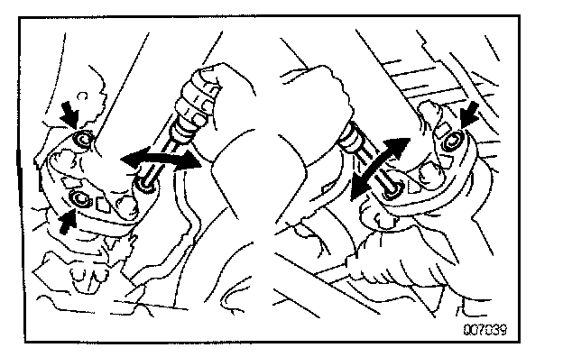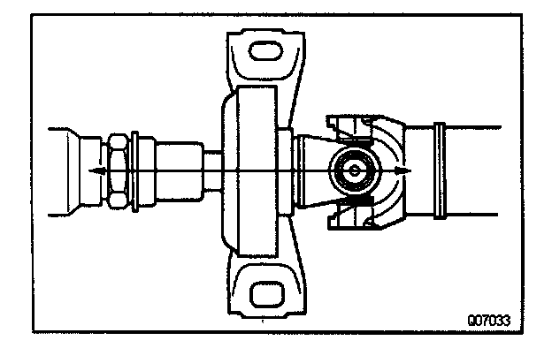 NOTICE: Support the center support bearing by hand so that the transmission and intermediate shaft. and propeller shaft and differential, remain in a straight line.