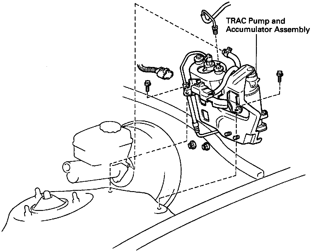 (b) Remove 2 nuts, bolts and TRAC Pump and Accumulator assembly.