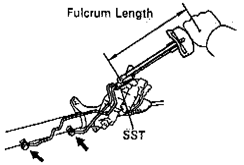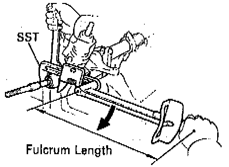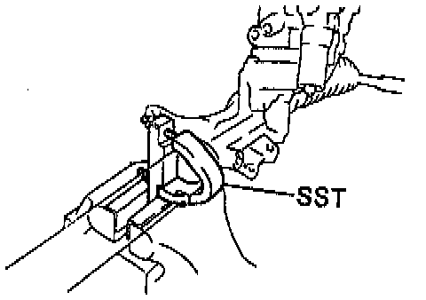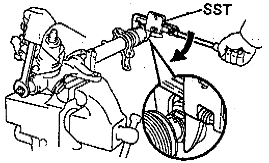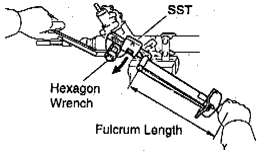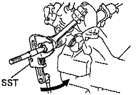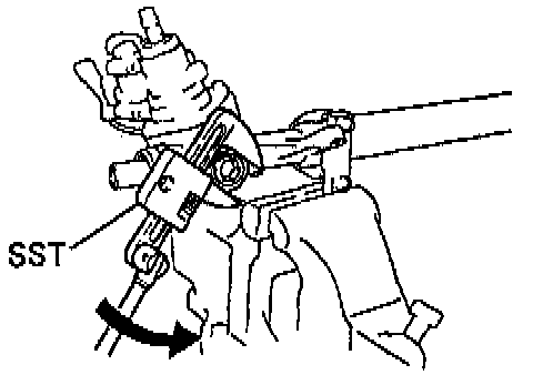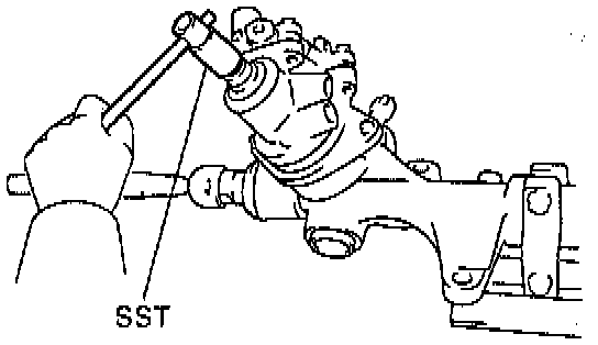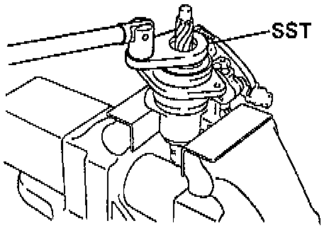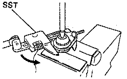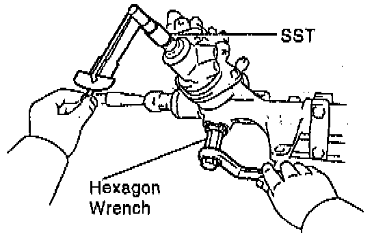 b. Using a (24 mm) hexagon wrench to stop the rack guide spring cap rotating, and using the 09922 - 10010 SST, tighten the nut to 50 Nm (37 ft. lbs.).