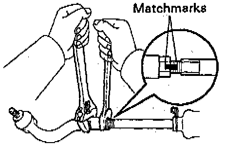 3. Remove the right and left hand tie rod ends and lock nuts after placing matchmarks on the tie rod end and rack end, and loosening the lock nut.