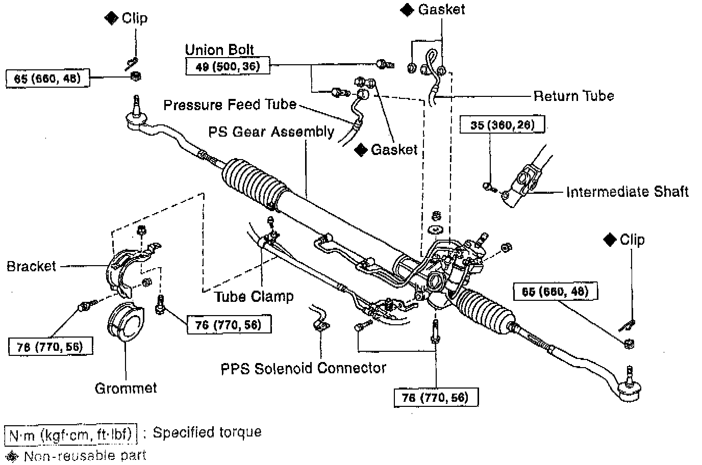 1. Install power steering gear assembly. Torque the two gear assembly set bolts and nuts.
