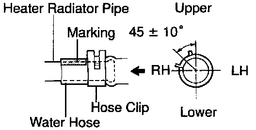 ^ Push the water hose onto the heater radiator pipe as far as the pipe grommet and install the hose clip.
