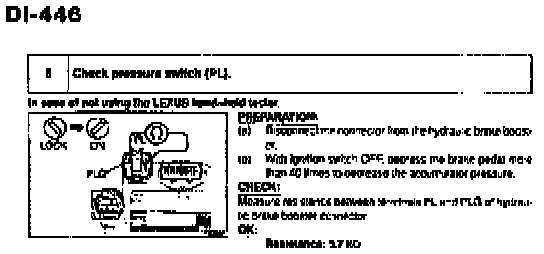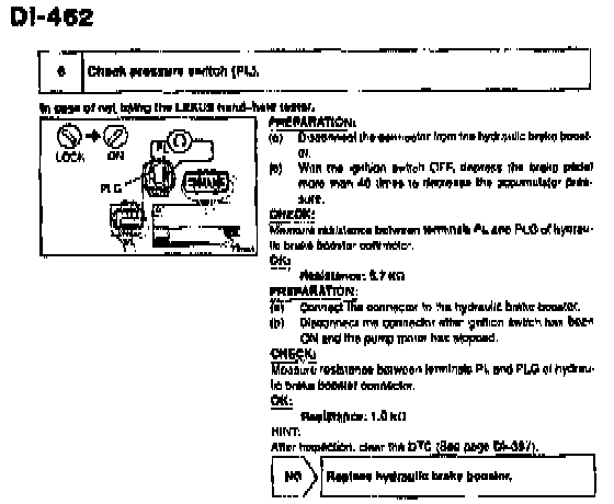 Step 6 - Check Pressure Switch (PL). The pressure switch (PL) condition of the hydraulic brake booster pressure is NOT VALID when using the Lexus Hand Held Tester, because the ABS/ TRAC and VSC ECUs do not support it.