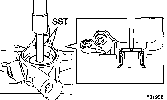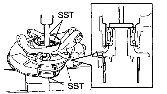 b. Using SST 09950-60010 (09951-00650), 09950-70010 (09951-07100) and a press, remove the hub bearing from the axle carrier.