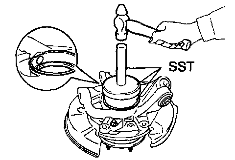 Using SST 09527-17011, 09950-60020 (09951-01030), 09950-70010 (09951-07100) and a hammer, install a new dust deflector to the axle carriers.