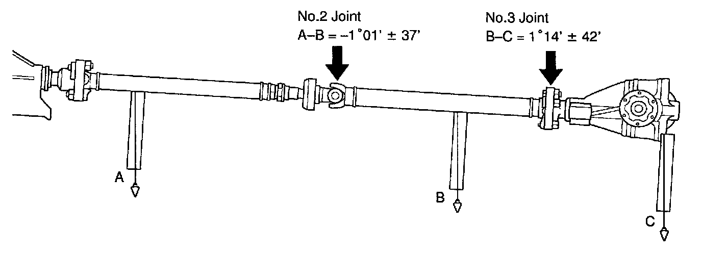 NOTICE: When performing operations which involve the removal and installation of the propeller shaft, always check the joint angle. Make adjustments if necessary.