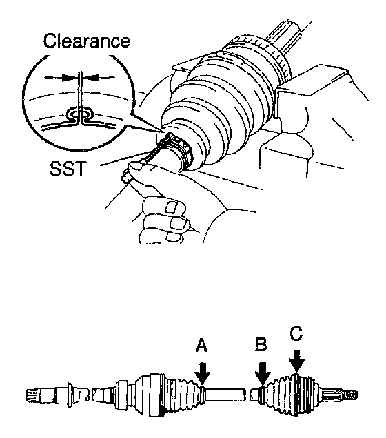 Align the matchmarks placed at removal, and using a snap ring expander, put in the inboard joint shaft expanding the snap ring.