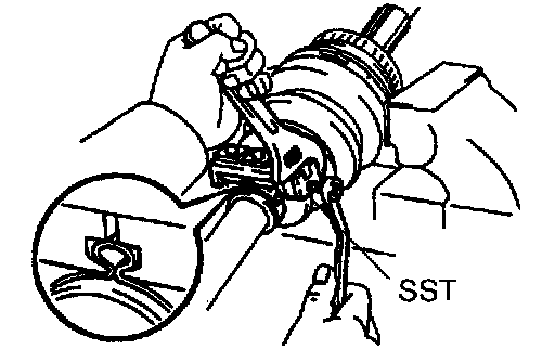 a. Using pliers, draw the hook together and remove the large inboard joint boot clamp and remove them.