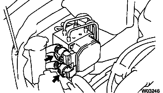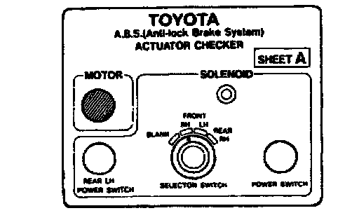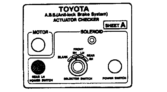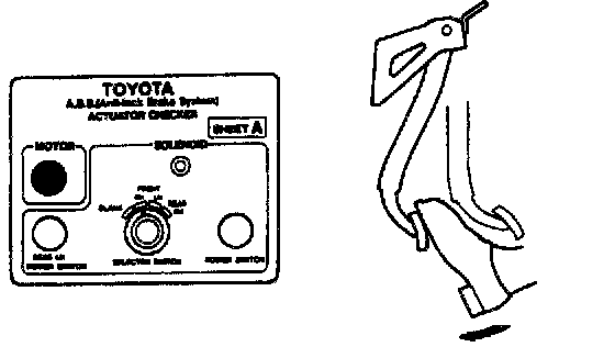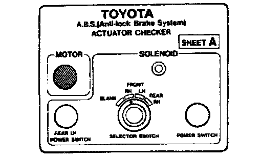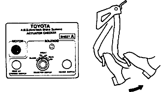 ON-VEHICLE INSPECTIONHINT: Using the ABS actuator checker (SST), check the operation of the actuator. If the actuator does not operate, proceed to "Antilock Brake System Testing and Inspection. Procedures; ABS With TRAC System, Trouble Code Diagnostic Procedures 11,12,13, and 14,"and check the operation of sub-wire harness G according to the instructions. If the solenoid and/or pump motor relay are abnormal, replace the relay and inspect the actuator operation again.
