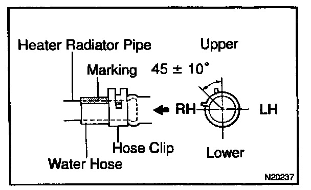 - Push the water hose onto the heater radiator pipe as far as the pipe grommet and install the hose clip.
