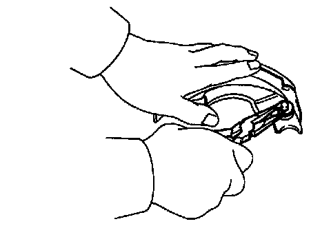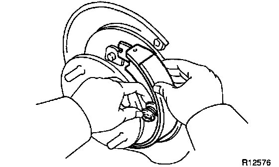 Apply chalk to the inside surface of the disc, then grind down the brake shoe lining to fit. If the contact between the disc and the brake shoe lining is improper, repair it using a brake shoe grinder or replace the brake shoe assembly.
