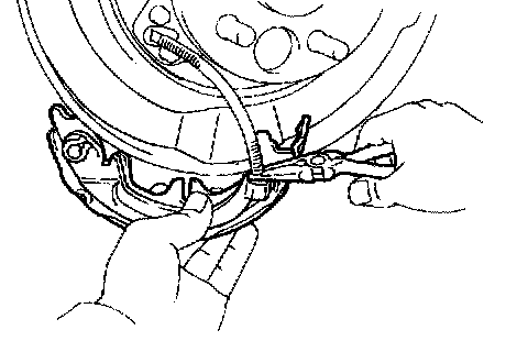 d) Using needle nose pliers, disconnect the parking brake cable from the parking brake shoe lever.