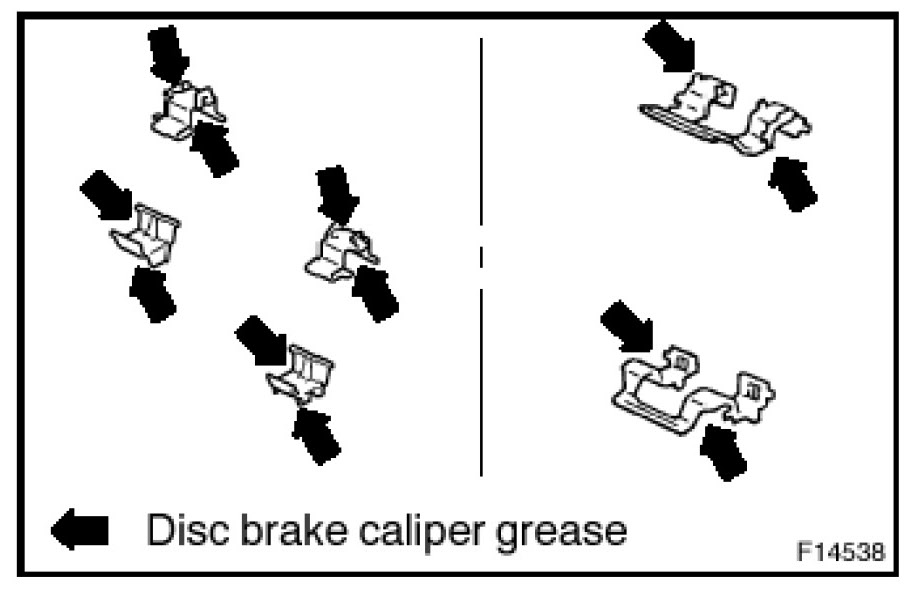 f) Apply the disc brake caliper grease to the areas indicated in the illustration.