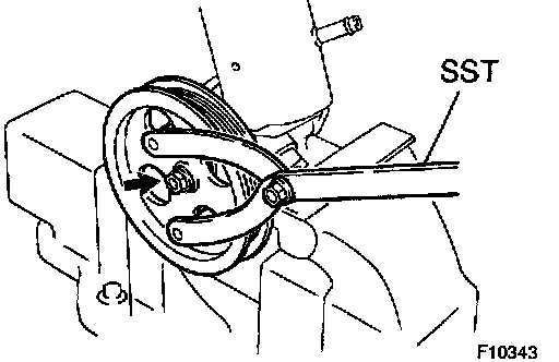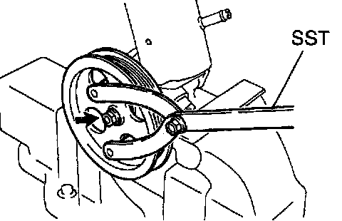 a. Install the vane pump pulley and nut to the vane pump shaft. Using SST, stop the pulley rotating and torque the pulley set nut.