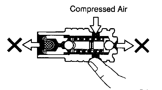 b. Check the flow control valve for leakage. Close one of the holes and apply compressed air 392- 490 kPa (4 - 5 kgf/cm2, 57 - 71 psi) into the opposite side, and confirm that air does not come out from the end holes.
