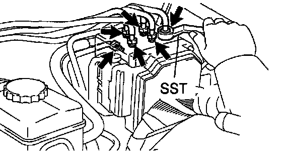 Using SST, disconnect the 6 brake lines from the brake actuator.