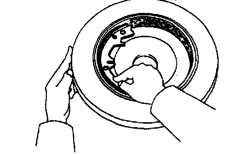 Apply chalk to the inside surface of the disc, then grind down the brake shoe lining to fit. If the contact between the disc and the brake shoe lining is improper, repair it using a brake shoe grinder or replace the brake shoe assembly.