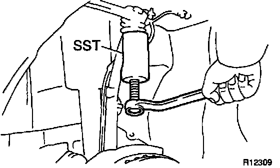 b. Using SST, disconnect the steering knuckle and remove it from the upper ball joint.