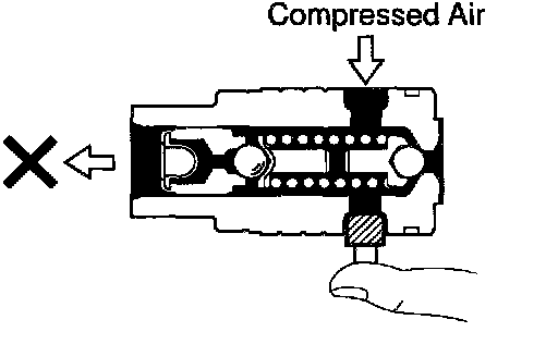 b. Check the flow control valve for leakage. Close one of the holes and apply compressed air of 392 - 490 kPa (4 - 5 kgf/cm2, 57 - 71 psi) into the opposite side hole, and confirm that air does not come out from the end hole.
