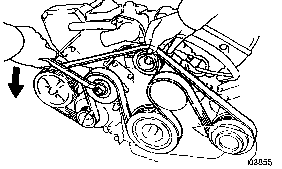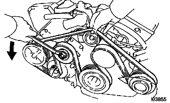 Loosen the drive belt tension by turning the drive belt tensioner counterclockwise, and remove the drive belt.