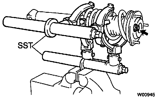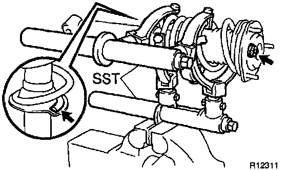 - When compressing the coil spring, tighten the 2 SST alternately so that the spring is compressed uniformly.