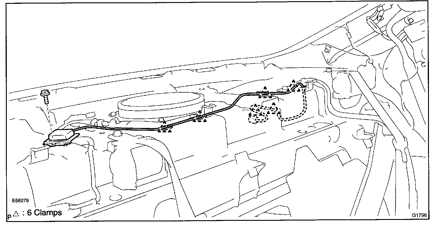 b. Remove the screw and 6 clamps, then remove the navigation antenna assy.