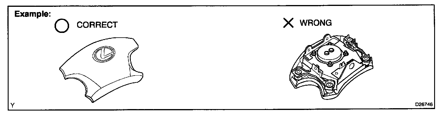1. Always store a removed or new front seat airbag assembly with the airbag direction facing upward. Placing the airbag assembly with the airbag inflation direction facing downward could cause a serious accident if the airbag inflates.