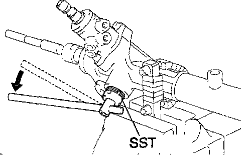 ^ Using SST, hold the power steering rack and install the steering rack end sub-assy.