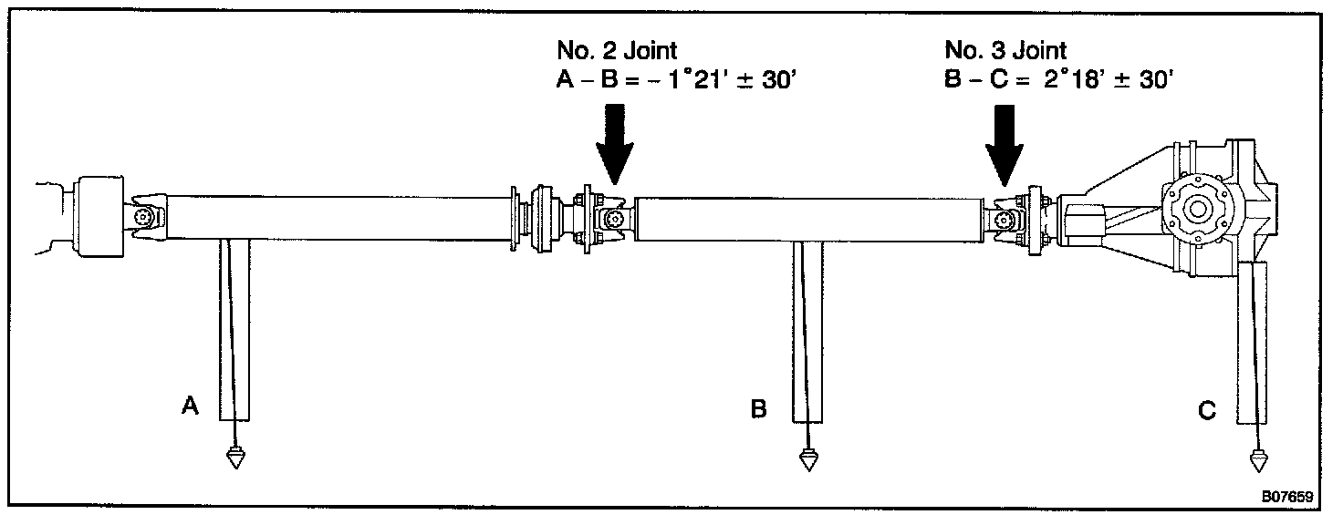 INSPECTION AND ADJUSTMENT OF JOINT ANGLE DURING REMOVAL AND INSTALLATION OF PROPELLER SHAFTWhen performing operations which involve the removal and installation of the propeller shaft, always check the joint angle. Make adjustments if necessary.