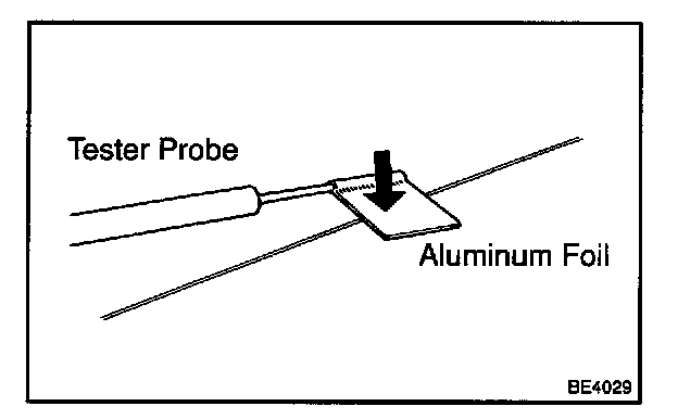 NOTE: In order not to damage the glass printed antenna, wrap up the tip of the tester stick with aluminum foil as shown in the illustration and check by holding the aluminum foil with a finger.