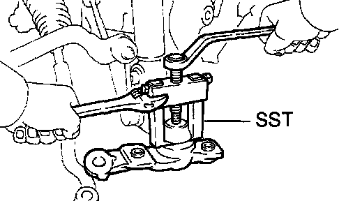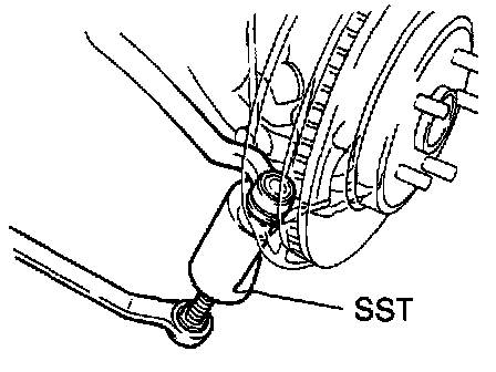 b. Using SST, disconnect the lower ball joint from the lower suspension arm.