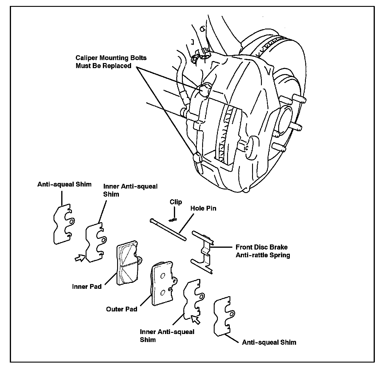 Be sure to install new bolts after removing the installation bolts from the brake caliper as indicated in the Repair Manual.