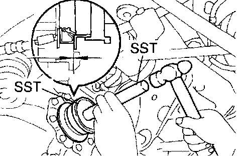 a. Using SST and a hammer, install a new oil seal until its end is flash with the surface of the differential carrier.