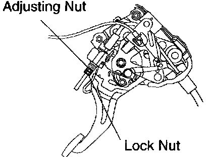 b. Loosen the lock nut and turn the adjusting nut until the pedal travel is correct.