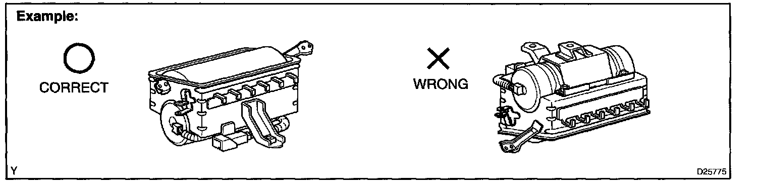 1. Always place a removed or new front passenger airbag assembly with the airbag deployment direction facing upward. Placing the airbag assembly with the airbag deployment direction facing downward could cause a serious accident if the airbag deploys.