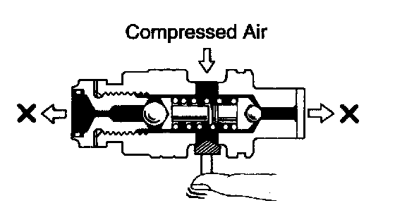 b. Check the flow control valve for leakage. Close one of the holes and apply 392 - 490 kPa (4 - 5 kgf/cm2, 57 - 71 psi) of compressed air into the opposite side hole, and confirm that air does not come out from the end holes.