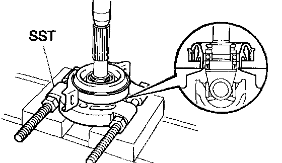 b. Using SST and a press, remove the center support bearing assy No. 1 and dust deflector.