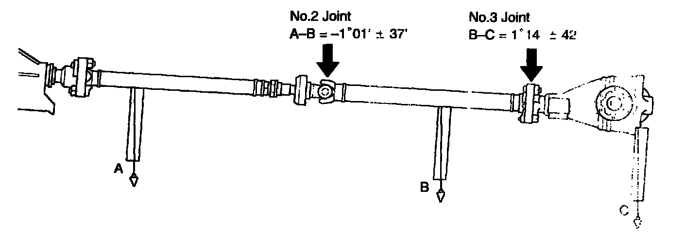 NOTICE: When performing operations which involve the removal and installation of the propeller shaft, always check the joint angle. Make adjustments if necessary.