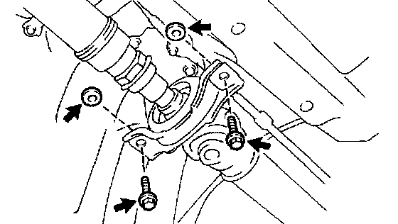 NOTICE: When removing the set bolts, support the center support bearing by hand so that the transmission and intermediate shaft, and propeller shaft and differential, remain in a straight line.