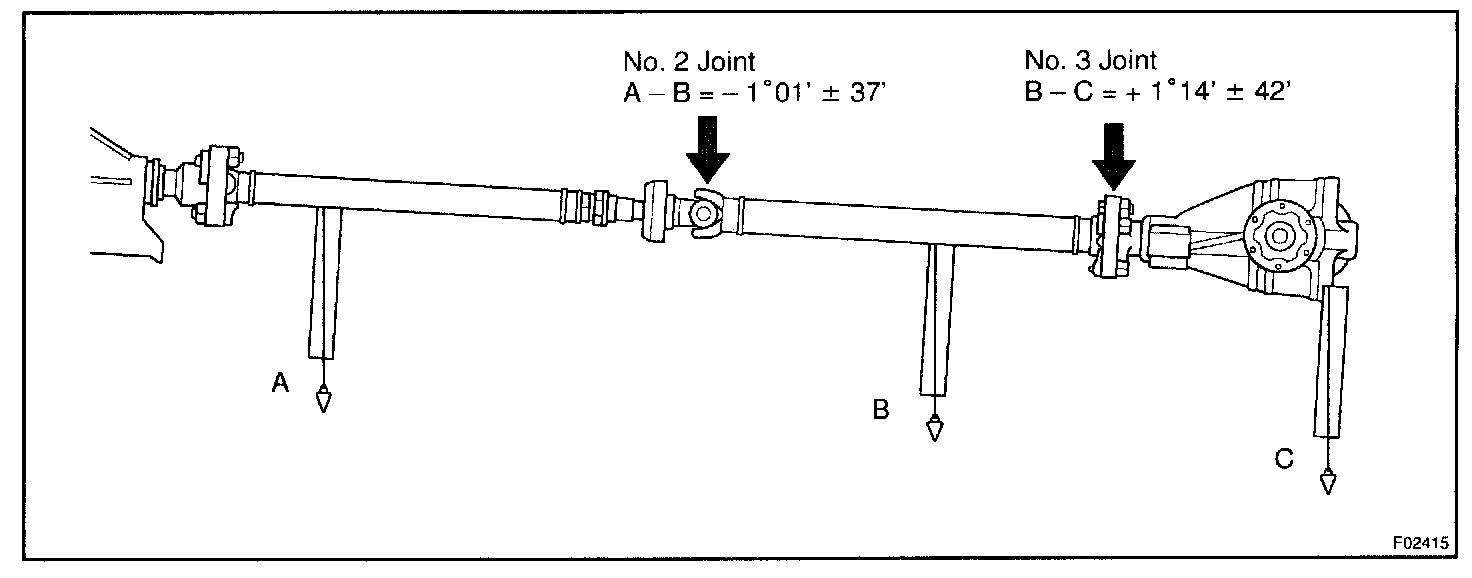 INSPECTION AND ADJUSTMENT OF JOINT ANGLE DURING REMOVAL AND INSTALLATION OF PROPELLER SHAFTWhen performing operations which involve the removal and installation of the propeller shaft, always check the joint angle. Make adjustments if necessary.