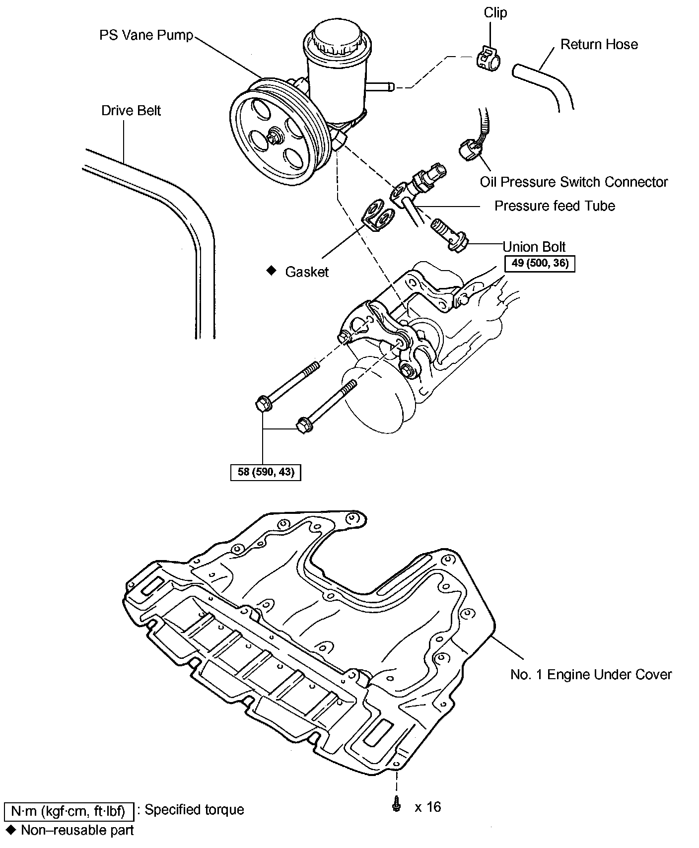 Remove the 16 screws, clip and No. 1 engine under cover.