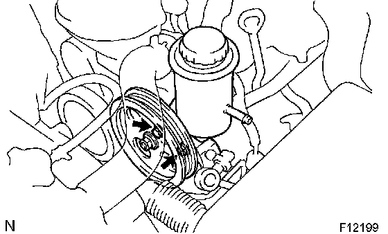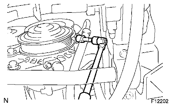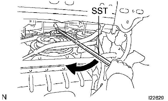 Using SST, loosen the drive belt tension by turning the drive belt tensioner clockwise from the bottom side, and remove the drive belt.
